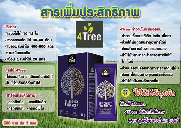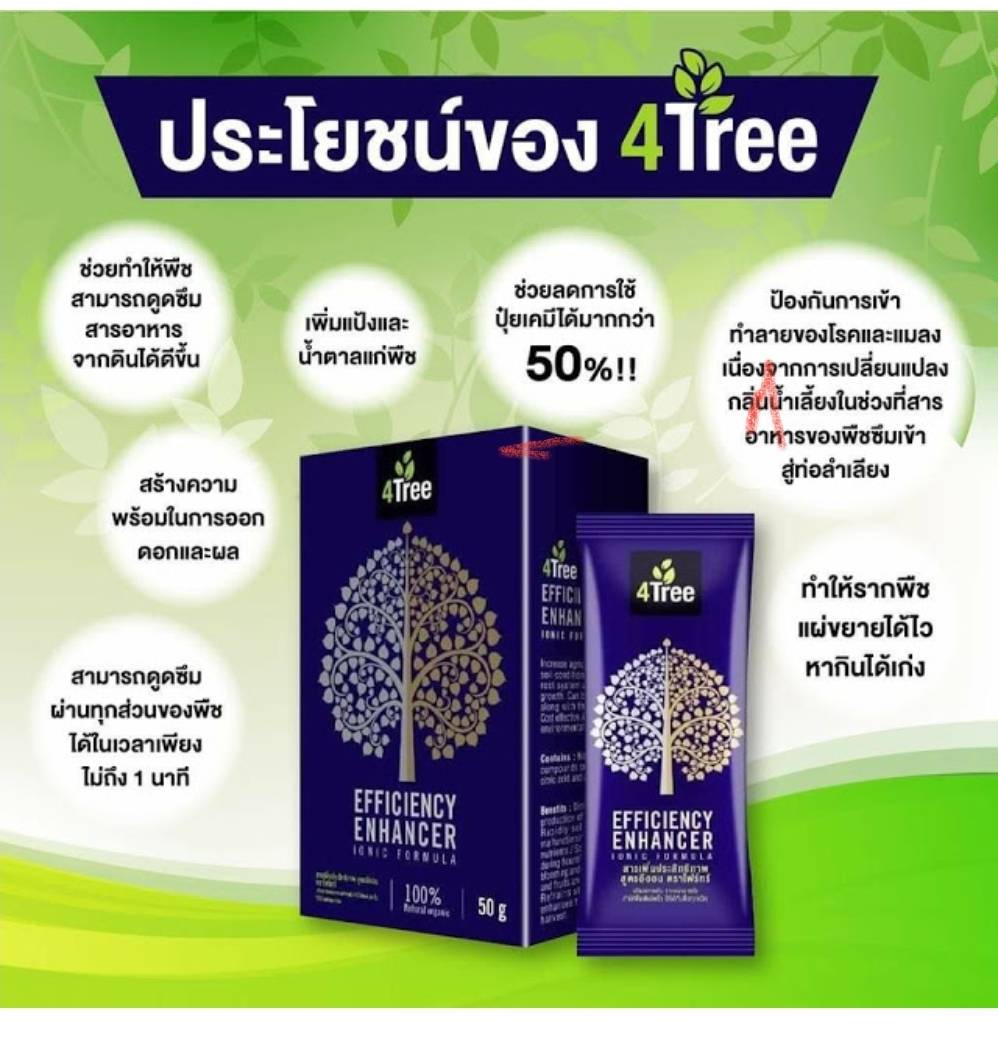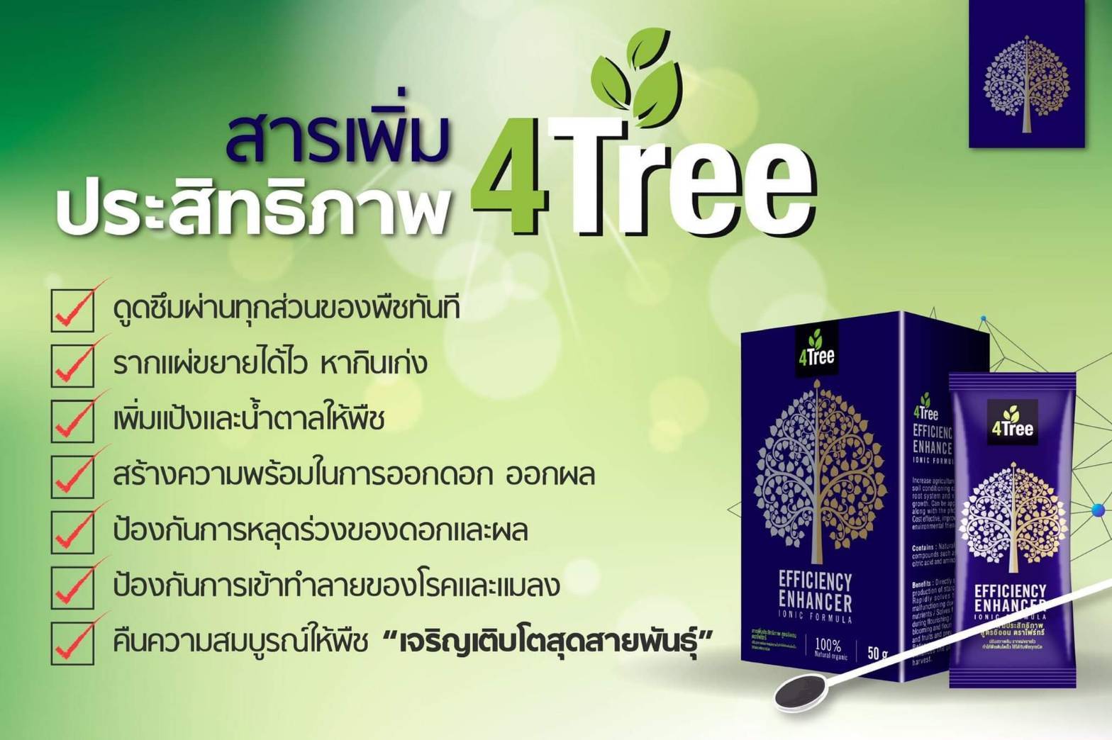 ศรัตรูพืชจะหมดไป เนื่องจากการเปลี่ยนแปลงของกลิ่นน้ำเลี้ยง ในช่วงที่สารอาหารของพืช ซึมเข้าสู่ท่อลำเลียง 4Tree เป็นนวัตกรรมใหม่ สกัดจากสารอินทรีย์ธรรมชาติ ได้แก่ กรดฮิวมิค กรดฟีโนลิค กรดซิตริค กรดอะมิโน และสารสกัด X-factor สุดยอดนวัตกรรม ของวงการ นำเข้าจากอิสราเอล ลิขสิทธฺ์เฉพาะของเอโฟร์เอส ช่วยเพิ่มแป้ง และน้ำตาลให้กับพืช สร้างความพร้อมในการออกดอกและผล เพิ่มขนาดของผลให้โตสุดสายพันธ์ พืชพรณของท่านจะออกดอก ออกผล เป็นเงิน เป็นทอง 4Tree เพื่อนคู่คิด มิตรคู่ใจ เป็นของขวัญสู่เกษตรกรยุคใหม่ ยุค 2021