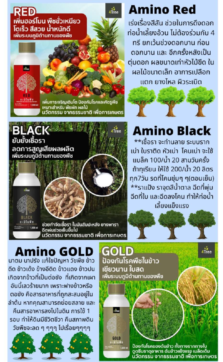 กลุ่มจุลินทีย์สำหรับต้นข้าวในนาข้าวโดยเฉพาะ ช่วยในการปกป้องโรค ของต้นข้าวที่เกอดจากทาง ราก ใบ ส่งเสริมการดูดซึมธาตุอาหาร ของต้นข้าวทั้งทางใบ และทางราก ให้ได้รับอย่างเต็มที่ เพิ่มความสมบูรณ์ แข็งแรง ของต้นข้าวทนต่อสภาพแวดล้อม ช่วยให้เมล็ดข้าวน้ำหนักดี เมล็ดเต็มรวง รวงข้าวมีความเหนียว เก็บเกี่ยวได้มาก ไม่เสียผลิตจากการหลุดร่วง ใช้ได้ทั้งการทำนาปรังและนาปี ลดต้นทุน เพิ่มผลผลิต ปลอดสารพิษ เป้นมิตร กับสิ่งแวดล้อม เกษตรกร ยุคใหม่ เลือกใช้ 4Tree เป็นอะมิโนพืช เพิ่มความแข็งแรงให้กับต้นข้าว เพิ่มการดูดซึมสารอาหาร ของระบบราก ช่วยการแตกกอ ในระยะแรกของต้นข้าวได้ดี ทนต่อโรคในนาข้าว ใบเขียวสด ทนแล้ง ส่งผลรวงเหนียว เมล็ดข้าวไม่หลุดร่วง เมล็ดข้าวไม่ลีบ